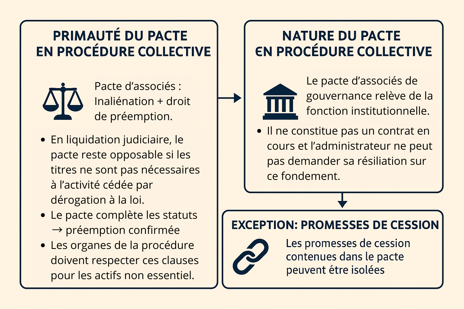 En effet, le pacte, parce qu’il participe de la fonction institutionnelle du groupement, se rattache aux statuts sociaux et échappe au régime des contrats à exécution successive. Dans une seconde décision rendue le même jour, la cour précise toutefois que les promesses de cession contenues dans le pacte peuvent, à titre exceptionnel, être examinées isolément, leur résiliation n’étant possible que si elle est strictement nécessaire à la sauvegarde du débiteur.