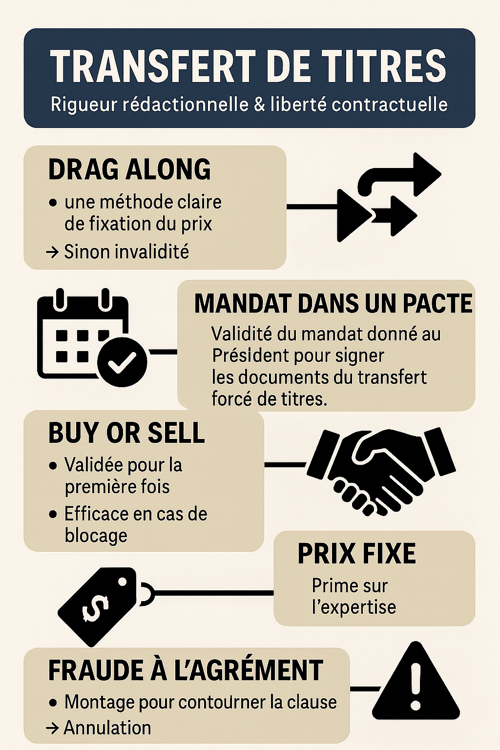 • Les juges confirment la validité des mécanismes de drag along, buy or sell, bad leaver, mais en exigent une rigueur rédactionnelle accrue ;